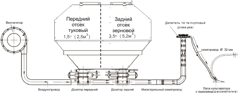 Пневмотранспортная система (рис.4) транспортирует семена и удобрения от бункера к конечной точке посева (к триплетам культиваторных лап) с помощью воздушного потока. Вентилятор приводится в действие от ВОМ трактора.